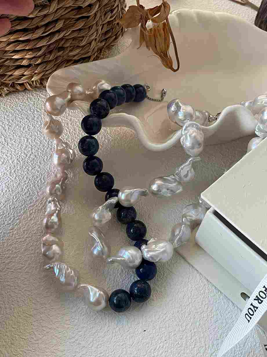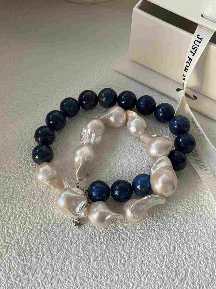 This necklace pairs rich lapis lazuli beads with bold baroque pearls, set in solid 925 sterling silver for a distinctive, elegant statement.
