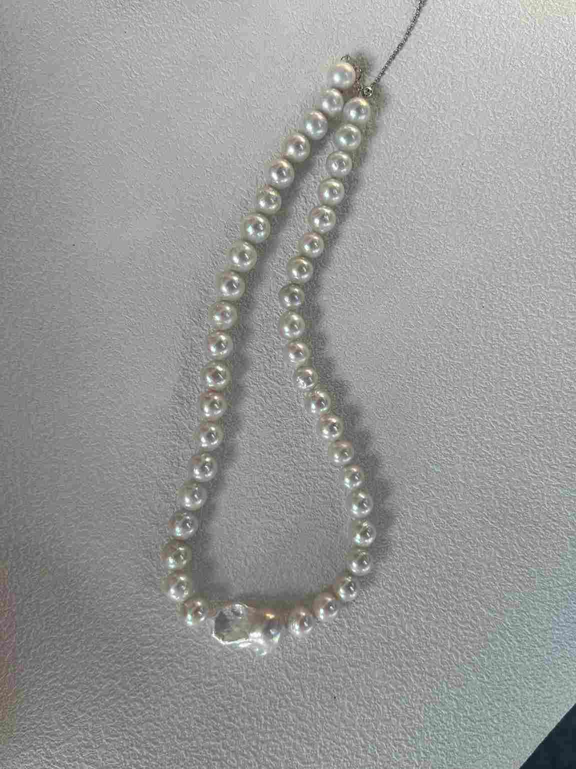 Round Edison pearls are paired with a statement baroque pearl centerpiece, finished with a sterling silver chain for effortless everyday elegance.