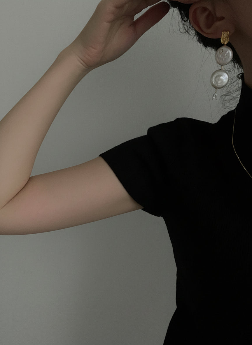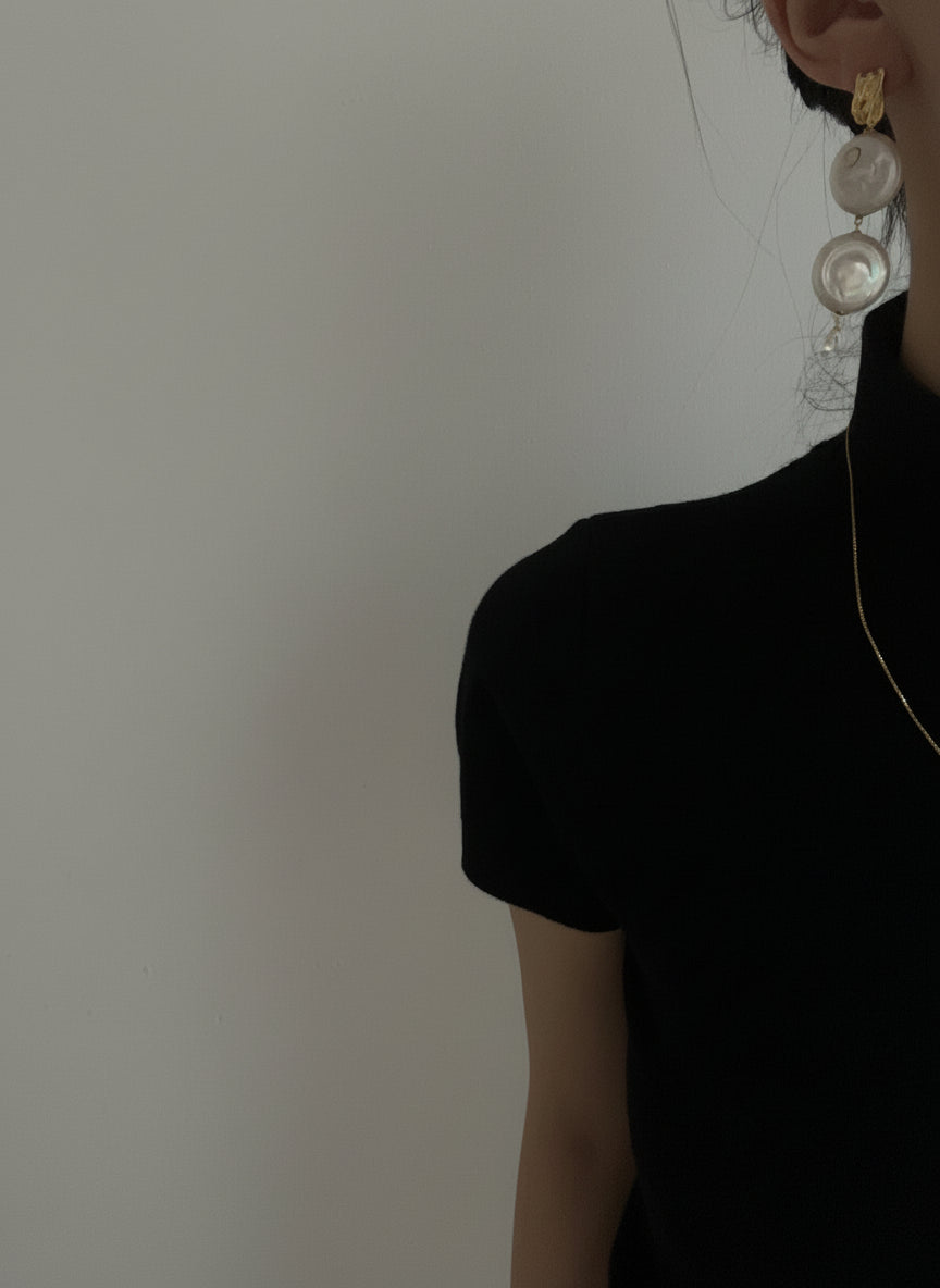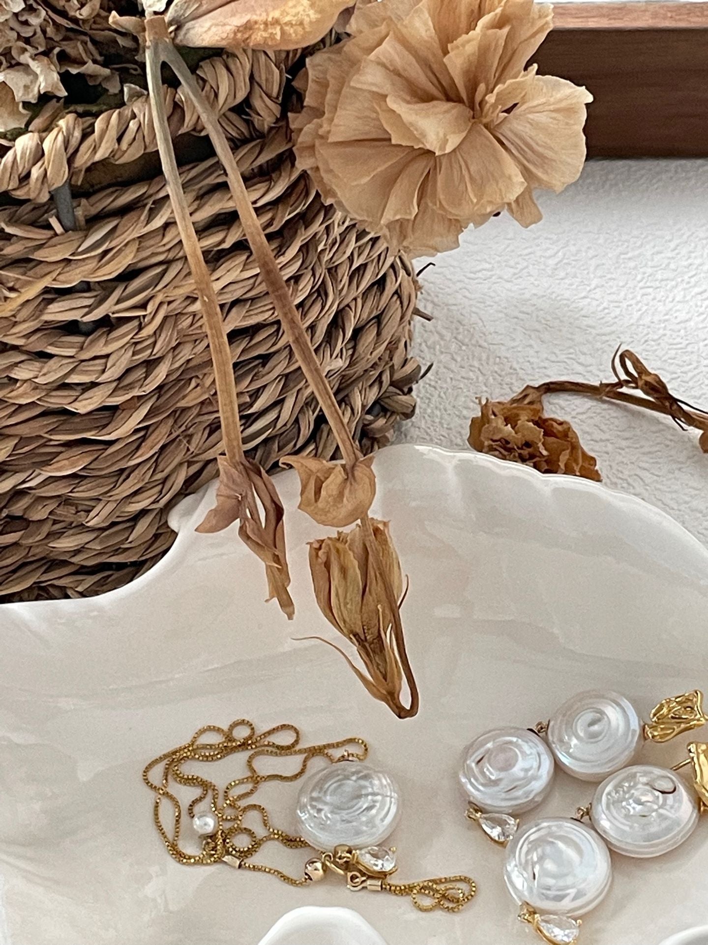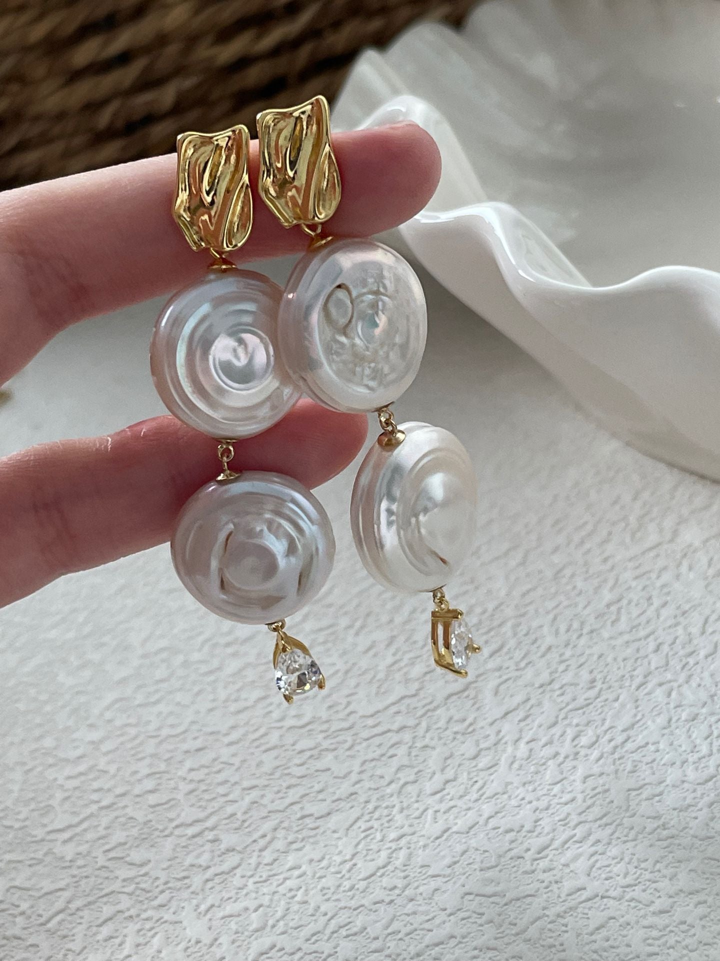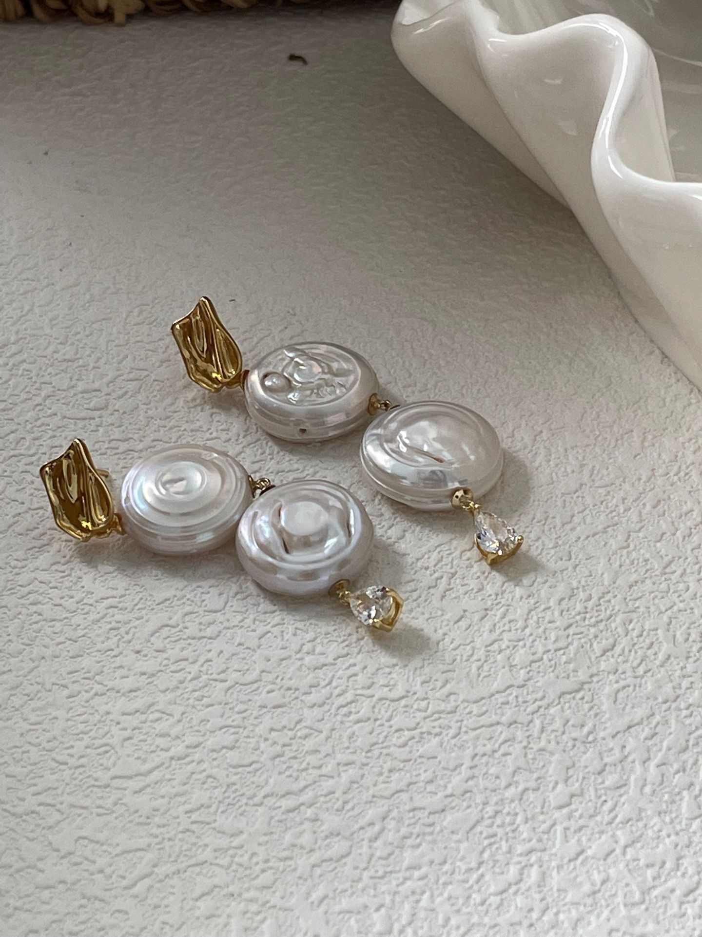 ✦ Layered swirl-textured pearl discs paired with sculptural gold elements and a teardrop-cut crystal create a luminous, dimensional silhouette.