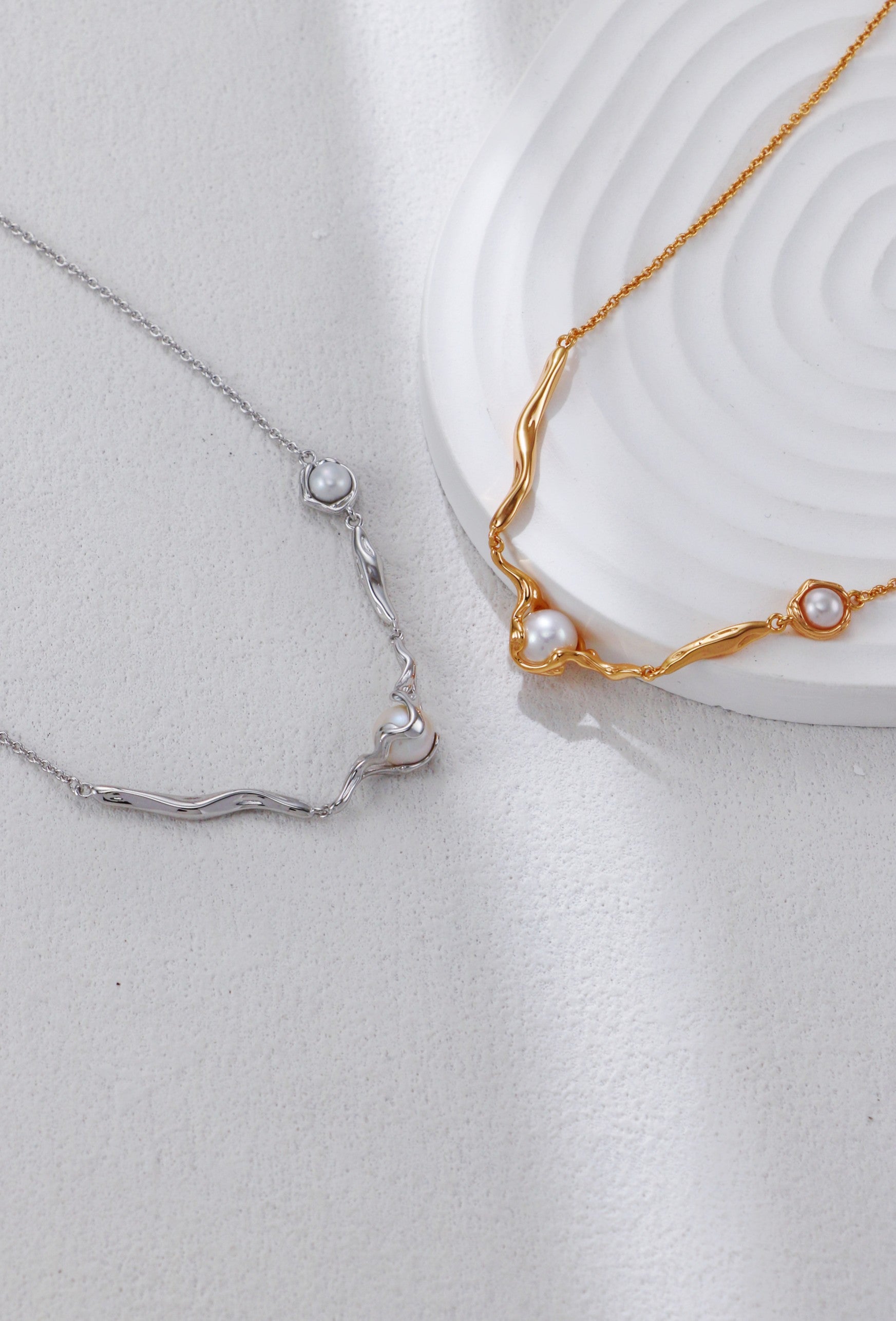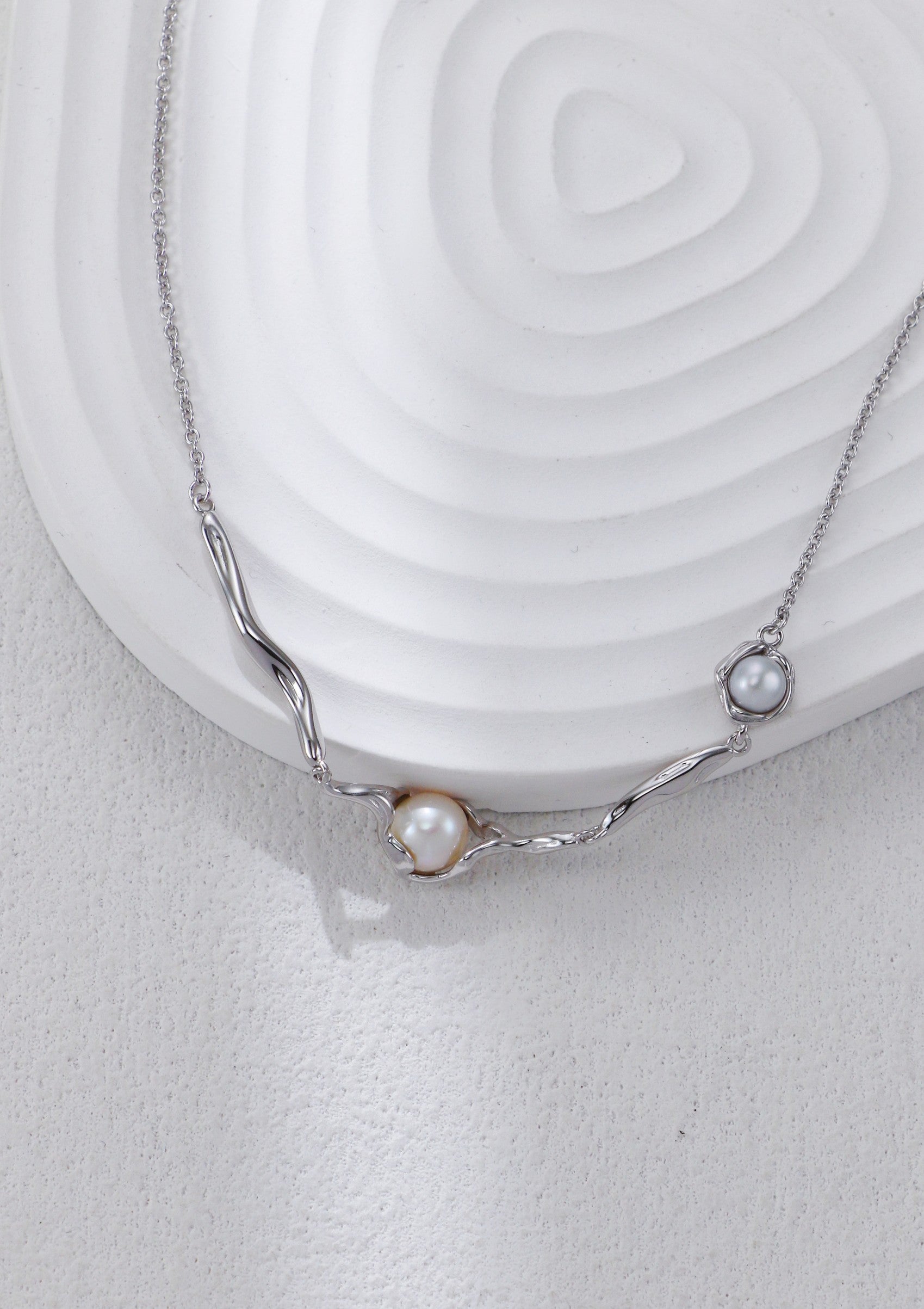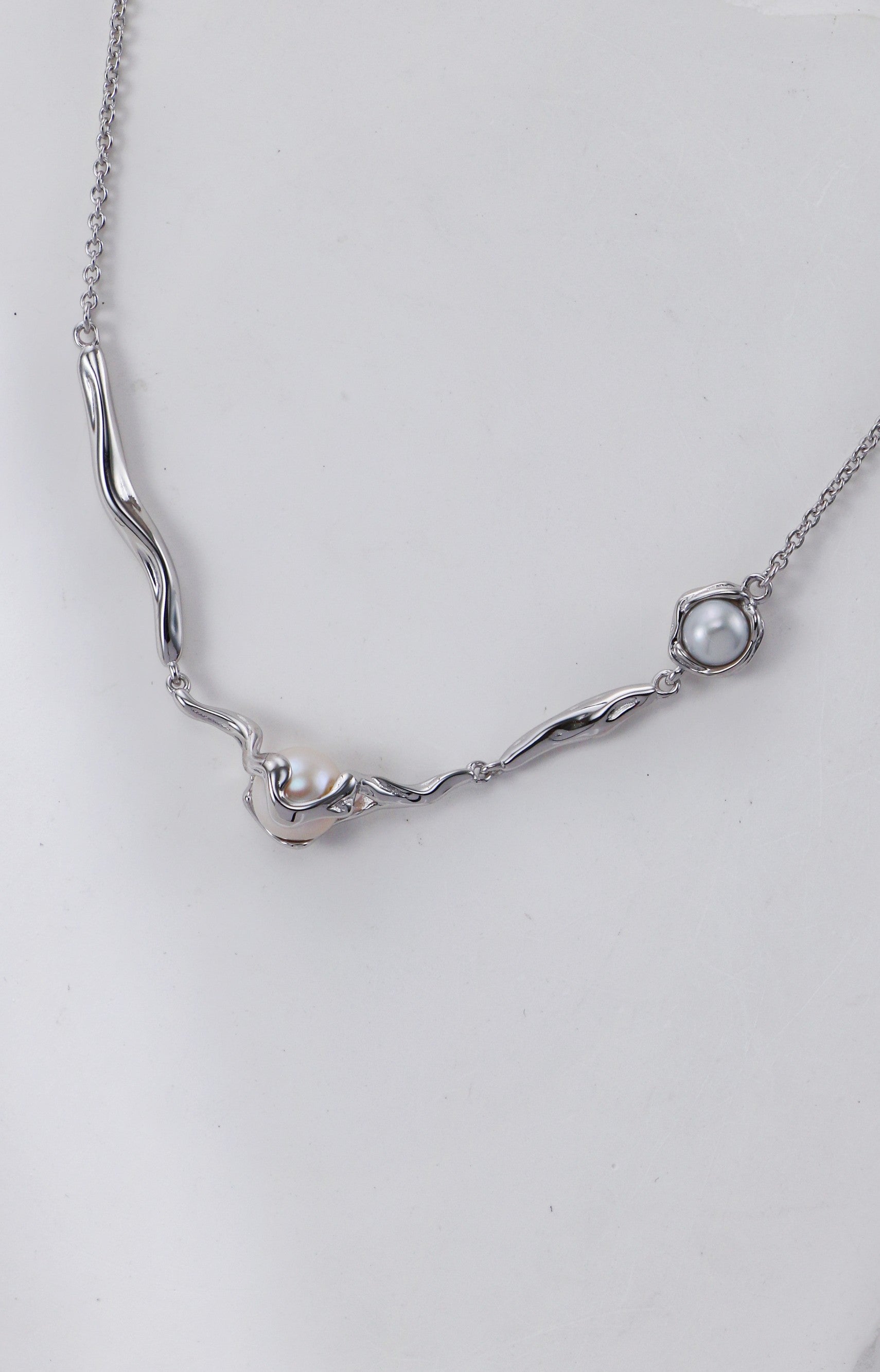 This pearl necklace is crafted in S925 silver, featuring a smooth round pearl paired with a delicate wave-shaped chain for a refined yet modern look.